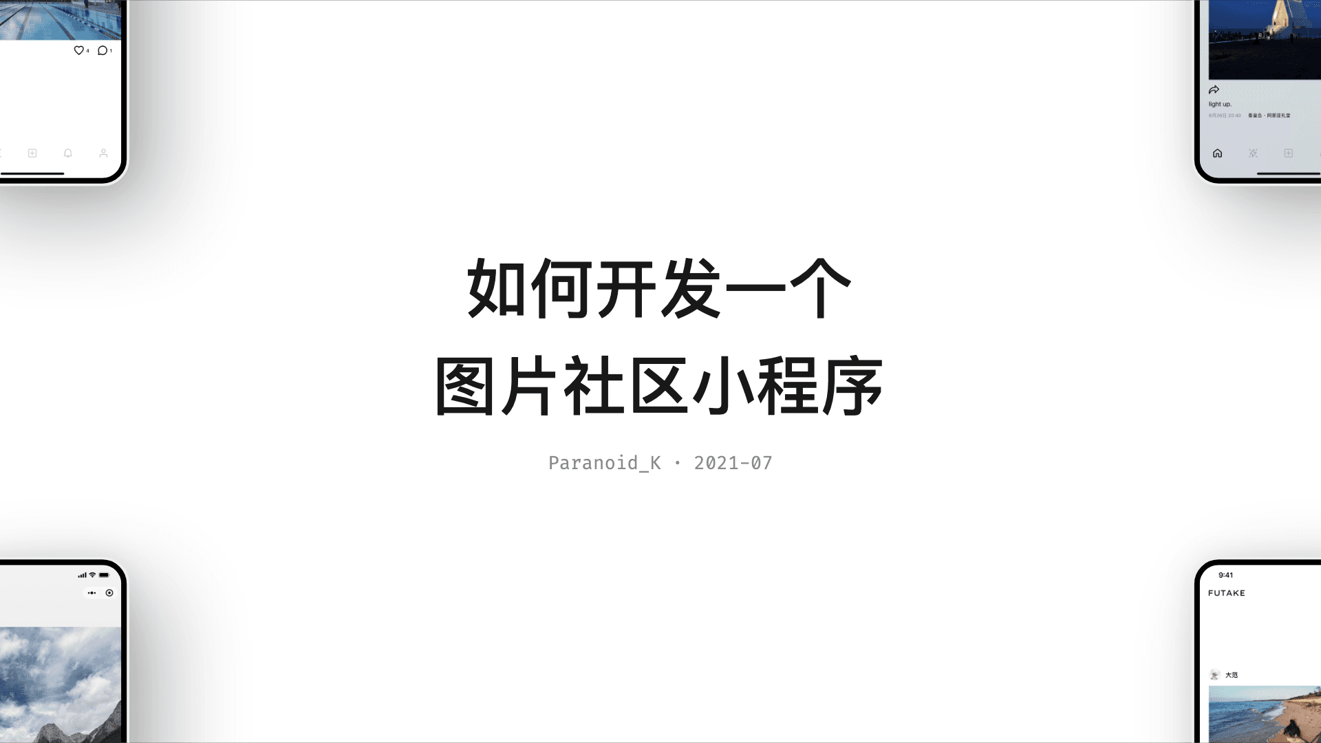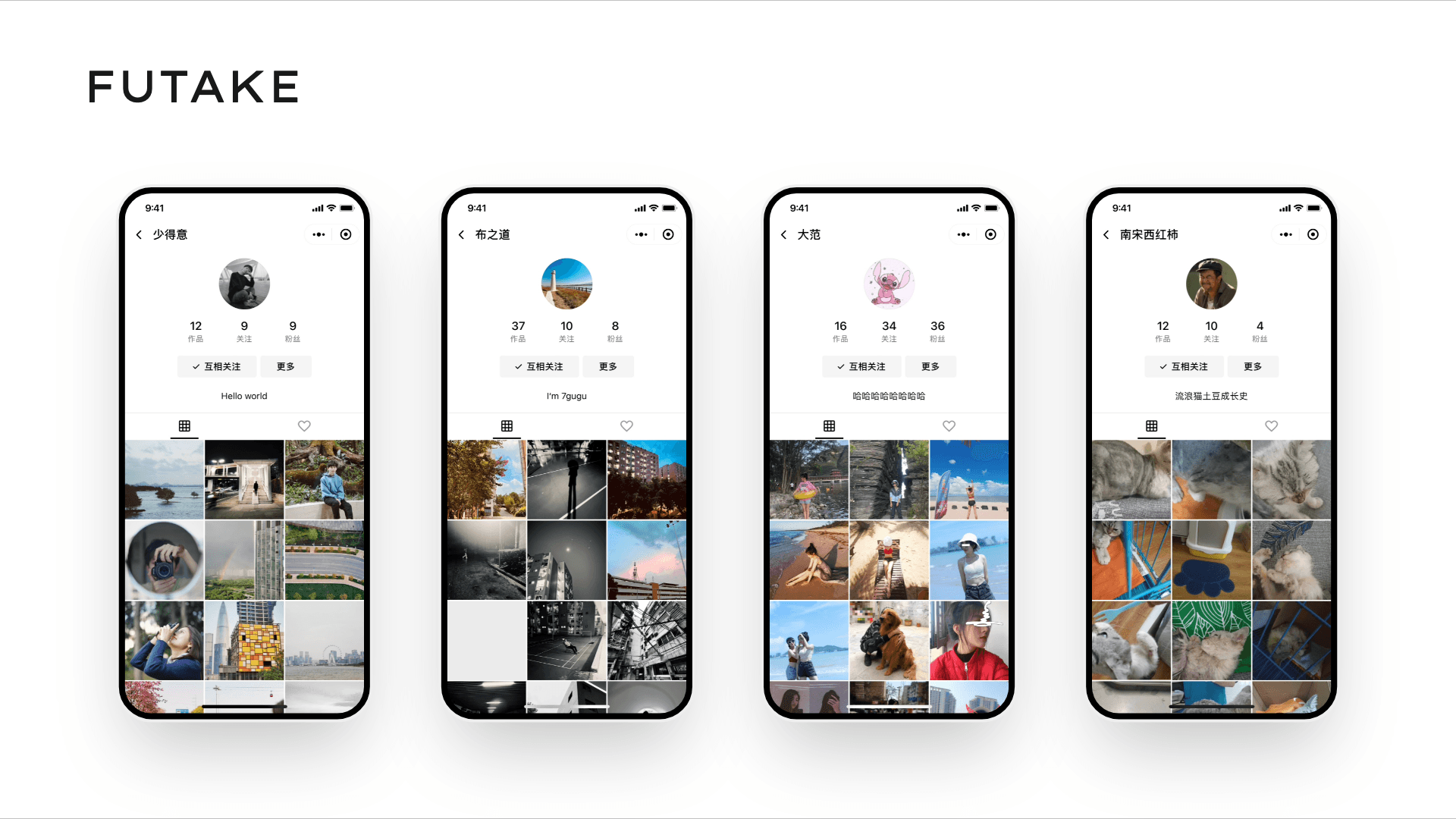 第二个项目是 FUTAKE,一个类似于 Instagram 的图片社区,以微信小程序的形式呈现。采用小程序的形式而不是独立的 App 有两方面的原因,一是小程序开发成本低,有助于快速实现出可用的产品;二是 App 推广难度大,获客成本高。