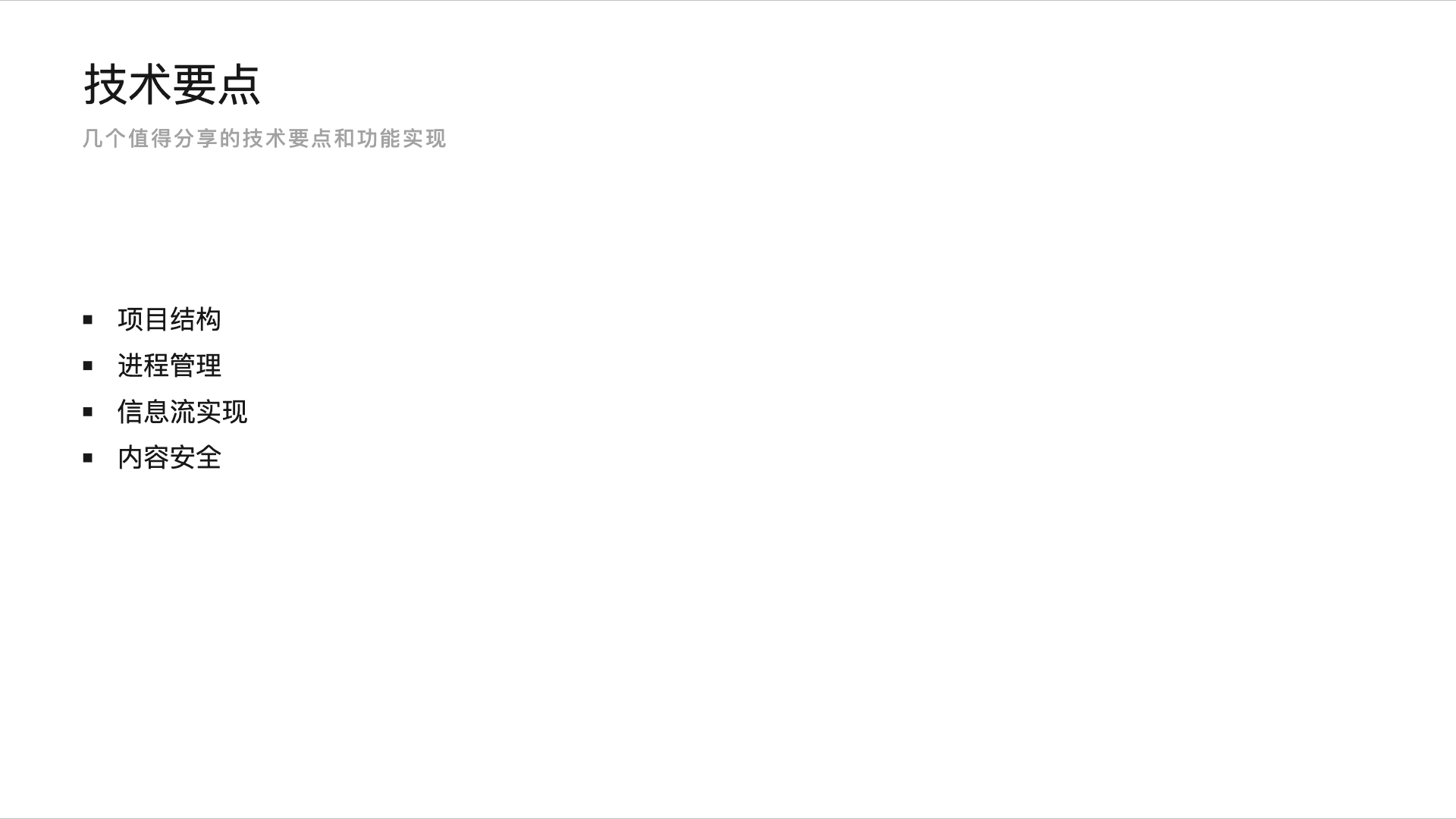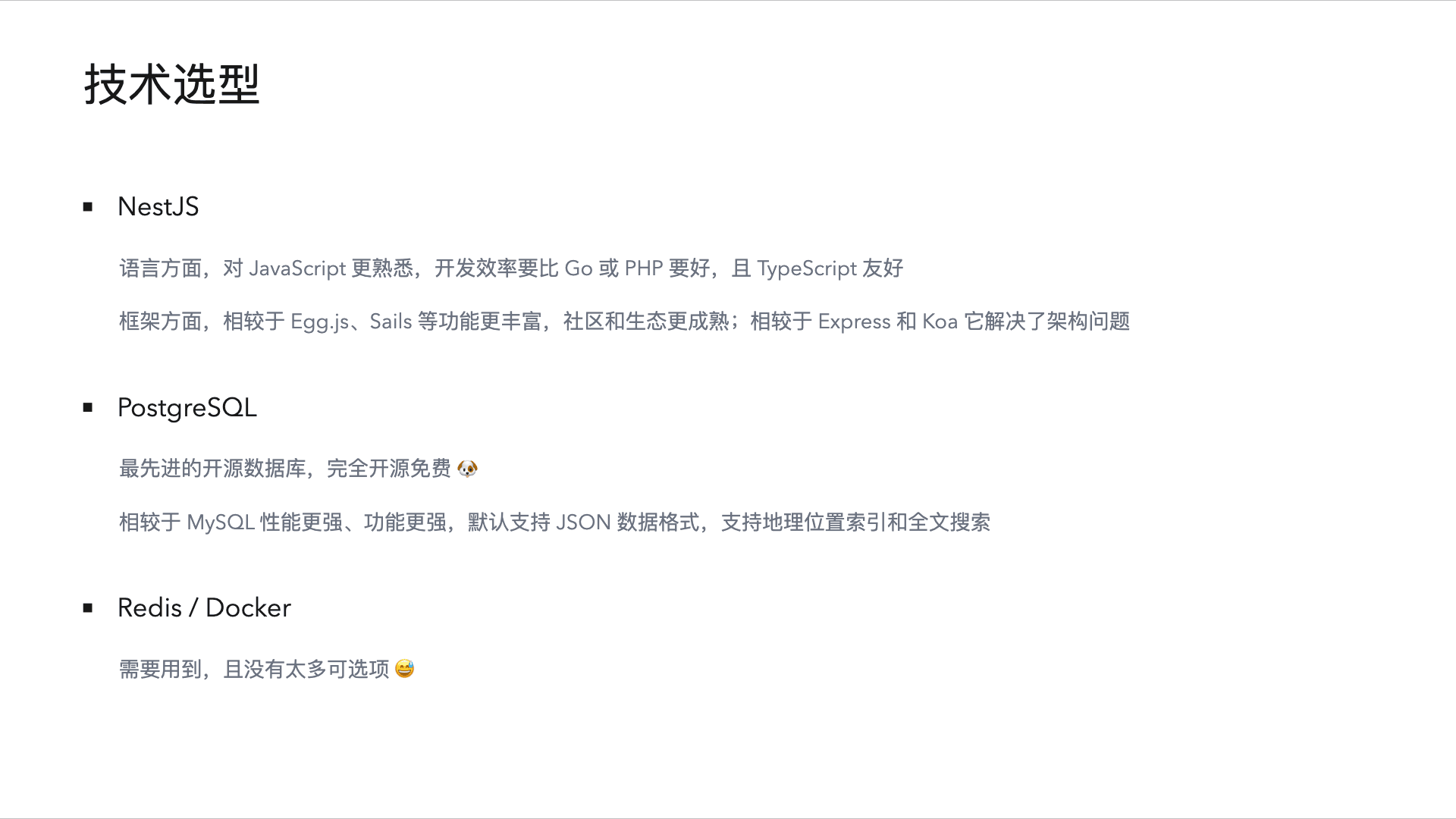 不过今天分享的内容不包含这些,今天分享的是后端相关的内容,后端是基于 Node.js 开发的,技术栈主要为 NestJS、PostgreSQL、Redis 和 Docker。