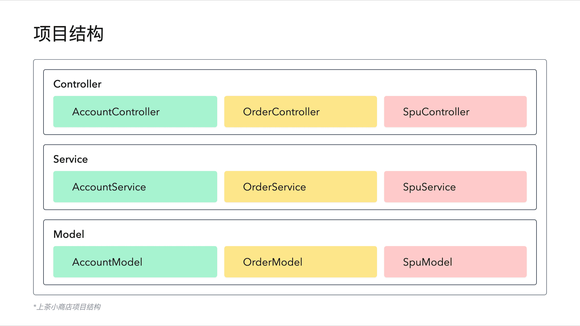首先是项目结构,上图是上茶小商店的项目结构,同时也是比较典型的 Node Web 应用的结构。大致等同于 MVC 结构,但由于没有 View 层,所以分为了 Model、Service 和 Controller 三层,Model 层负责与数据的交互,Service 层主要为业务逻辑,Controller 层用于接收和响应 HTTP 请求。