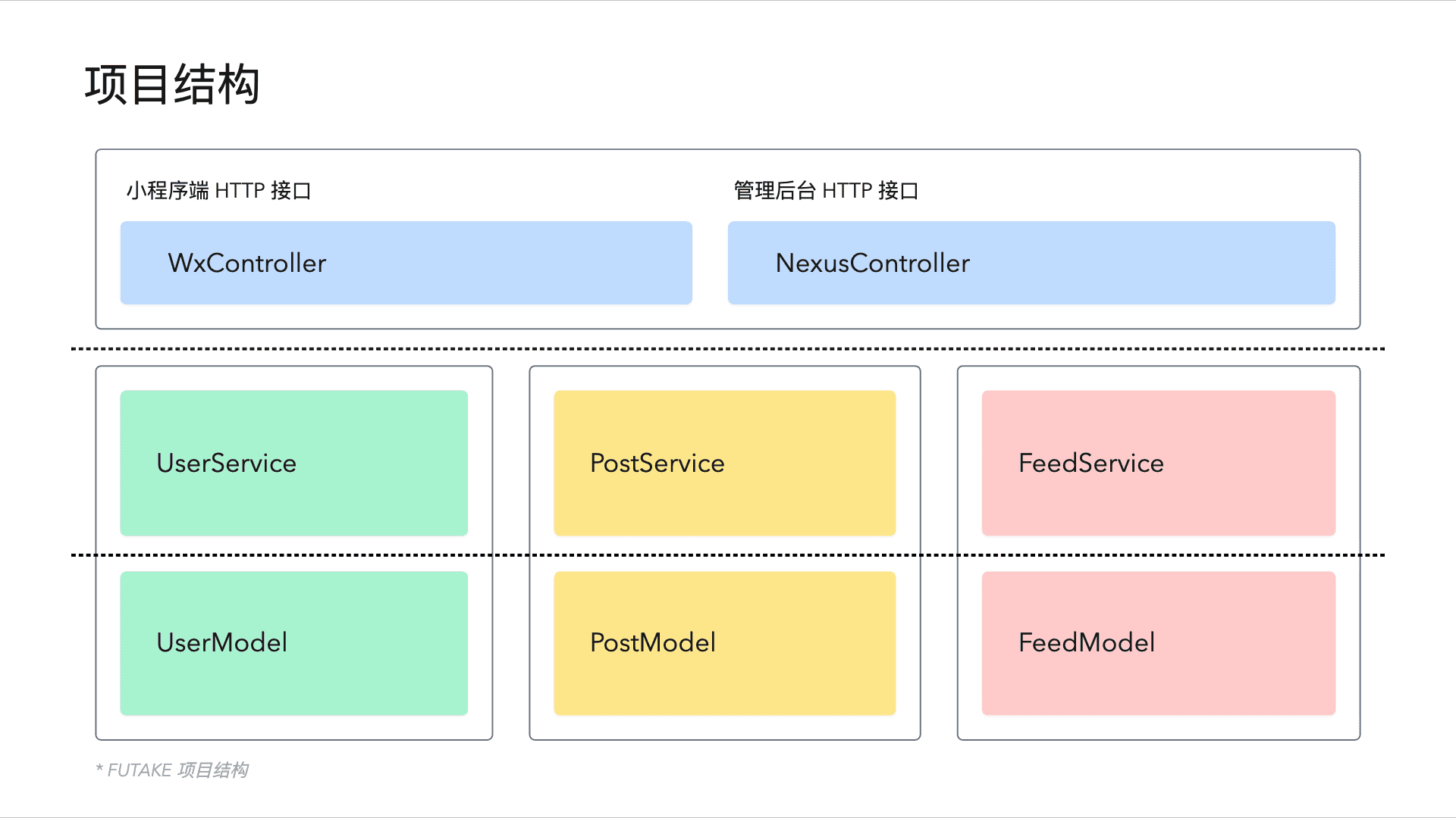 如上图是 FUTAKE 的结构,在水平方向上进行了分层,同时垂直方向也进行了模块划分,每一个黑色方框内为一个 NestJS 模块。目前整体为一个单体应用,但在这种结构下也可以比较方便地将每个模块拆分为一个独立应用,当用户量大了以后(希望会),单体应用无法支撑的时候可以将每个模块拆分为独立的应用,也就是所谓的微服务。比如 UserService 和 UserModel 组成的模块可以拆分为一个独立应用,只用来处理用户相关的逻辑。