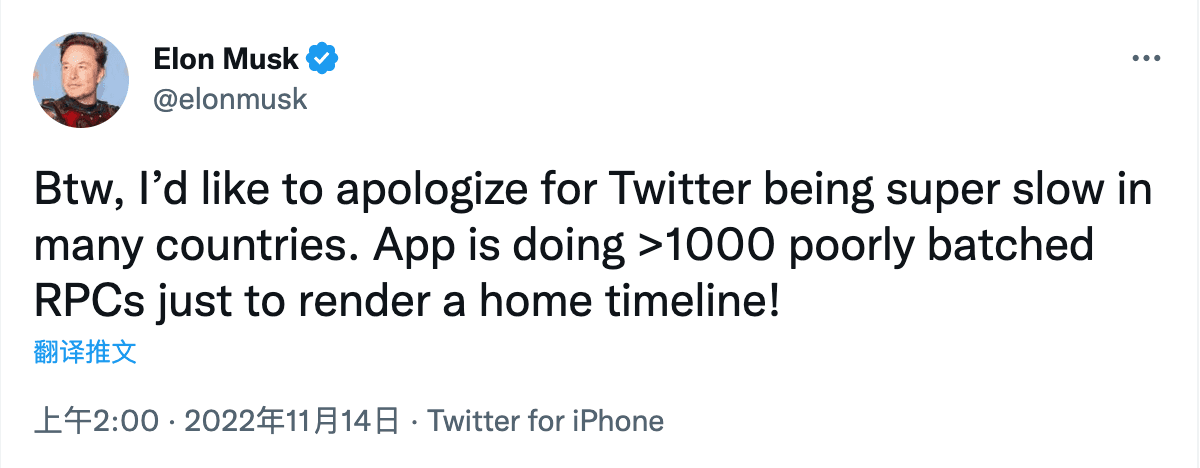 前几天马斯克发了一条推特向用户道歉,称 Twitter 在多个国家访问慢是因为首页时间线有 1000 多个 RPC 请求,然后有 Twitter 员工和马斯克争论导致被开除。